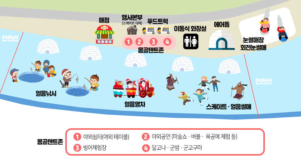 행사장 내부 배치도는 공식 웹사이트에서 확인할 수 있으며, 주요 시설의 위치가 명확히 표시되어 있어 관람객들이 보다 편리하게 이용할 수 있도록 도와줍니다. 스케이트장, 얼음낚시터, 먹거리 부스 등 주요 시설이 잘 배치되어 있어 한눈에 확인할 수 있습니다. 축제 기간 중에는 안내원이 배치되어 있어 필요시 도움을 받을 수 있습니다.