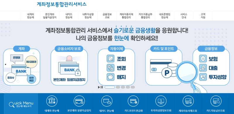 이 서비스를 이용하기 위해서는 스마트폰에 ‘어카운트 인포’ 앱을 설치하거나, ‘계좌정보 통합관리’ 웹사이트에 접속하면 됩니다. 휴대폰, 신용카드, 공동인증서 중 하나로 간단한 인증 과정을 거치면 회원가입 없이도 서비스를 이용할 수 있습니다.