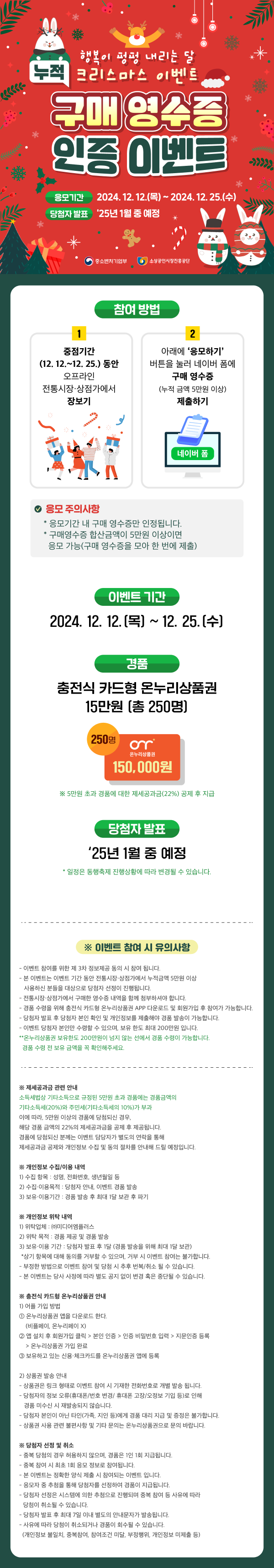 크리스마스 이벤트 : 중점기간(12.12~12.25)동안 전통시장&상점가에서 5만원 이상(누적)상품을 구매한 영수증을 인증하면 추첨을 통해 충전식 카드형 온누리 상품권 15만원을 드립니다.